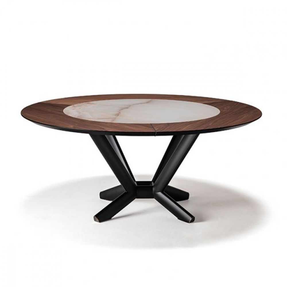Стол с основанием из стали, окрашенной в гофрированный титан (GFM11), графитовый (GFM69) или черный (GFM73) цвет или брашированную бронзу. Топ из ореха (NC) или обоженного дуба (RB) со вставкой из керамики под мрамор цветов: Calacatta (KM01), Alabastro (KM02), Ardesia (KM04), матовая Golden Calacatta (KM05), глянцевая Golden Calacatta (KM06), матовая Portoro (KM07), глянцевая Portoro (KM08) или глянцевая Sahara Noir (KM09). Детали в черном хроме (06).