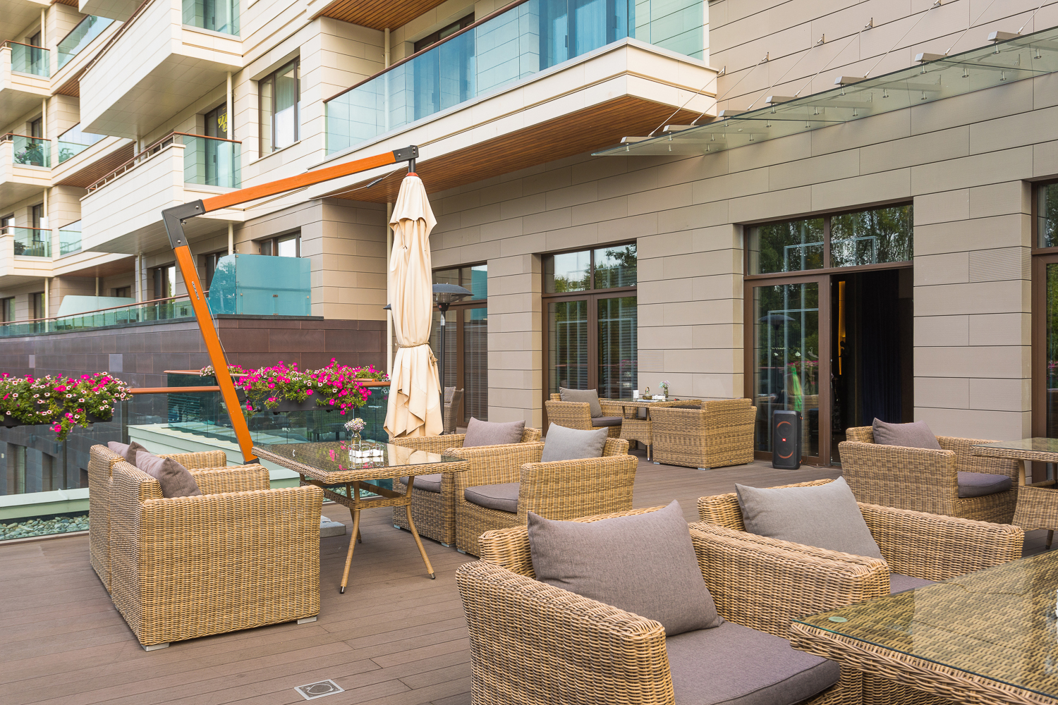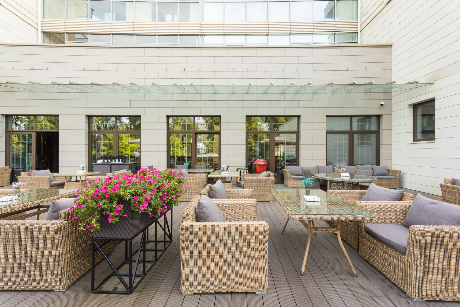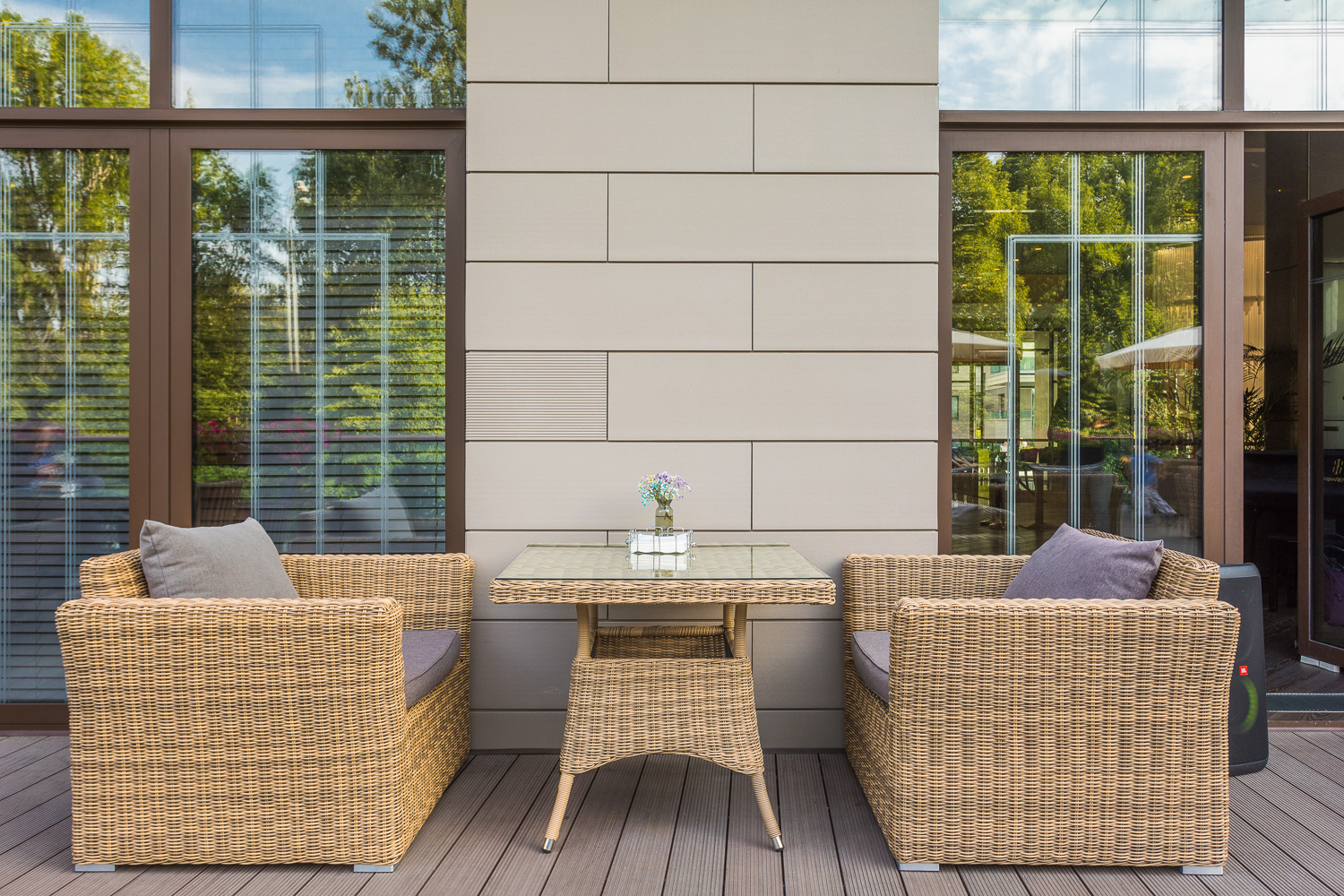 Ее отличает алюминиевый каркас высокой прочности. В качестве декоративной составляющей выступает ручное плетение на основе круглого искусственного ротанга. Оно выполнено в соломенном оттенке.