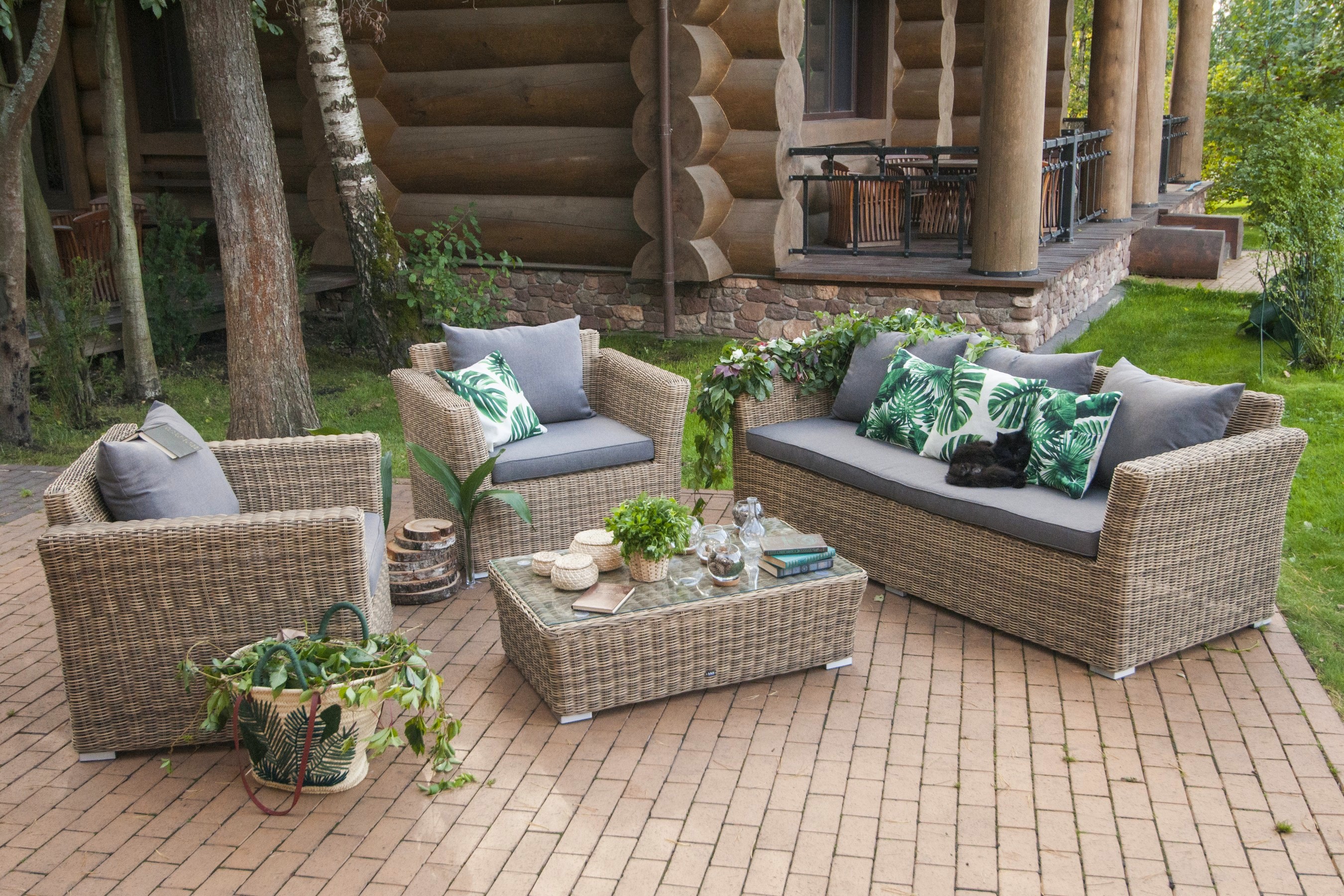 Две подушки серо-коричневого цвета представлены в комплекте с садовым креслом. Изделия пошиты из полиэстера плотностью 230гр/м2. В обязательном порядке материал обрабатывается влагоотталкивающей пропиткой для усиления своих защитных свойств.