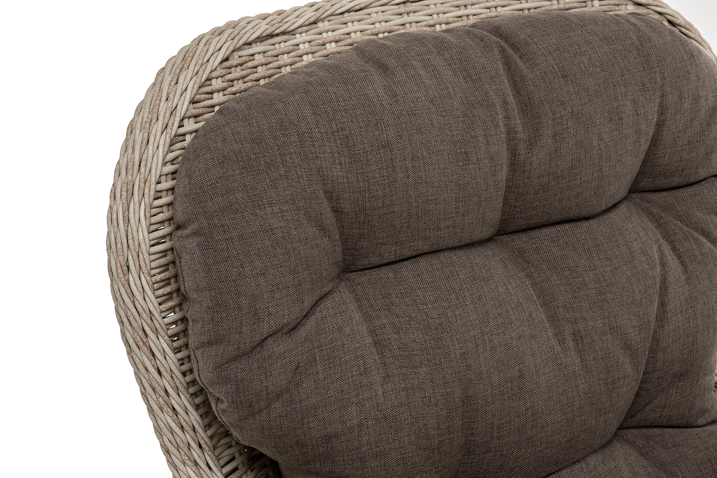 В садовое кресло укомплектовывается мягкими подушками. Они пошиты из износостойкого полиэстера серо-коричневого оттенка с плотностью 230гр/м2. Защитные свойства синтетического материала усиливаются благодаря влагоотталкивающей пропитке.
