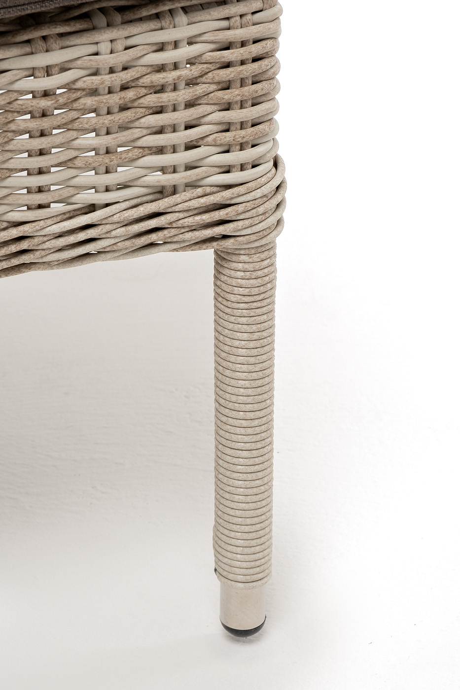 Каркас выполнен из высококачественного алюминия, который оплетен круглым искусственным ротангом бежевого цвета.