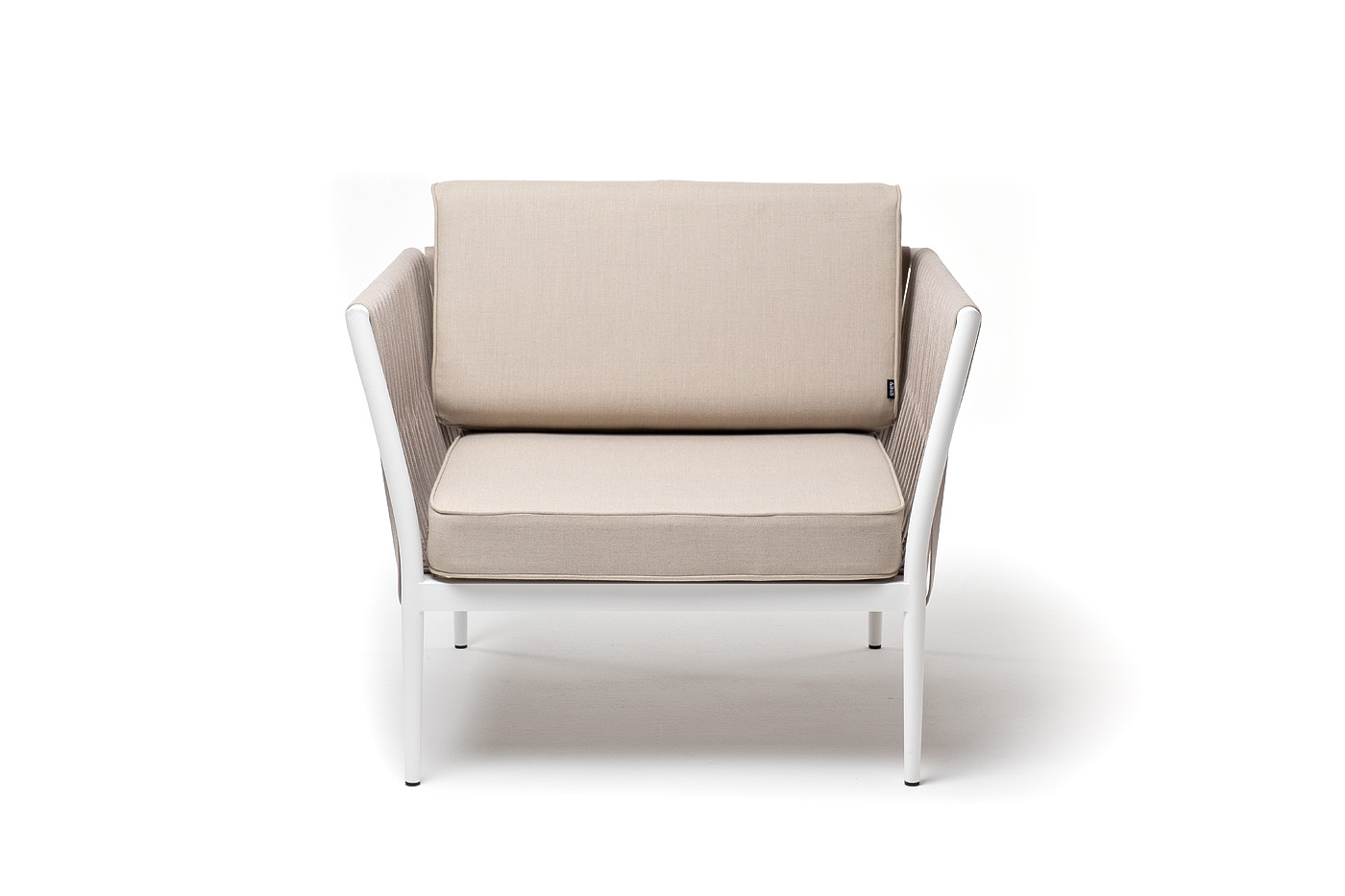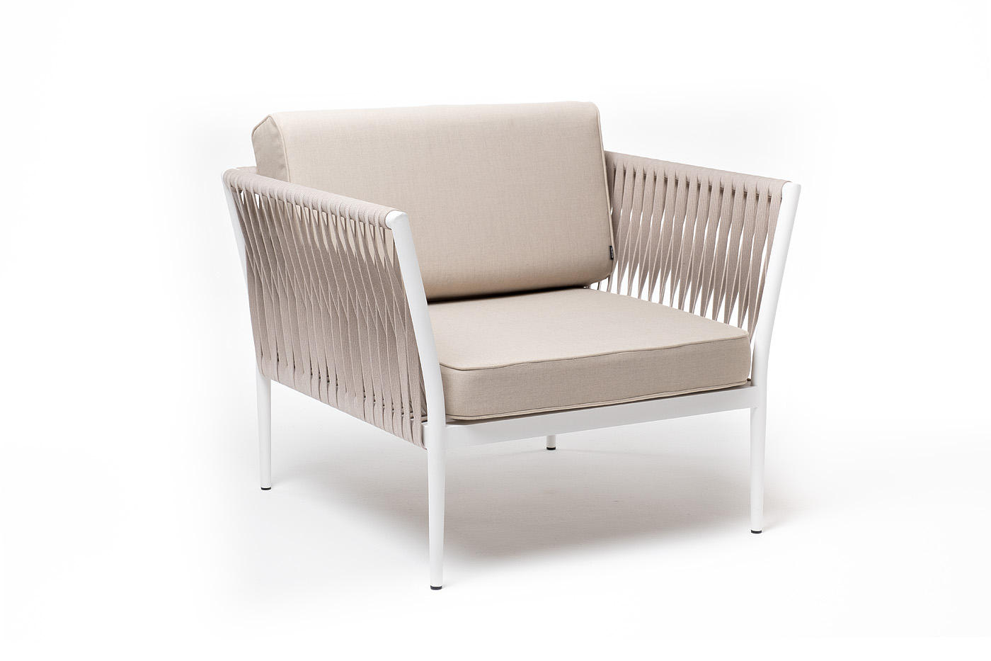Кресло имеет алюминиевый каркас, окрашенный порошковой краской белового цвет. Боковины каркаса вручную оплетены роупом - эластичными синтетическими лентами, изготовленными из высокопрочных полиэфирных волокон. Цвет оплетки - бежевый.
