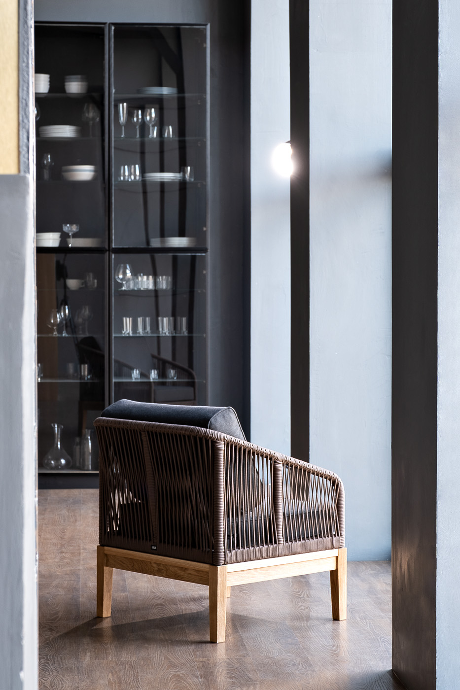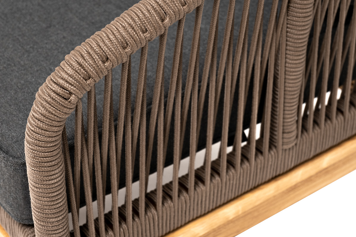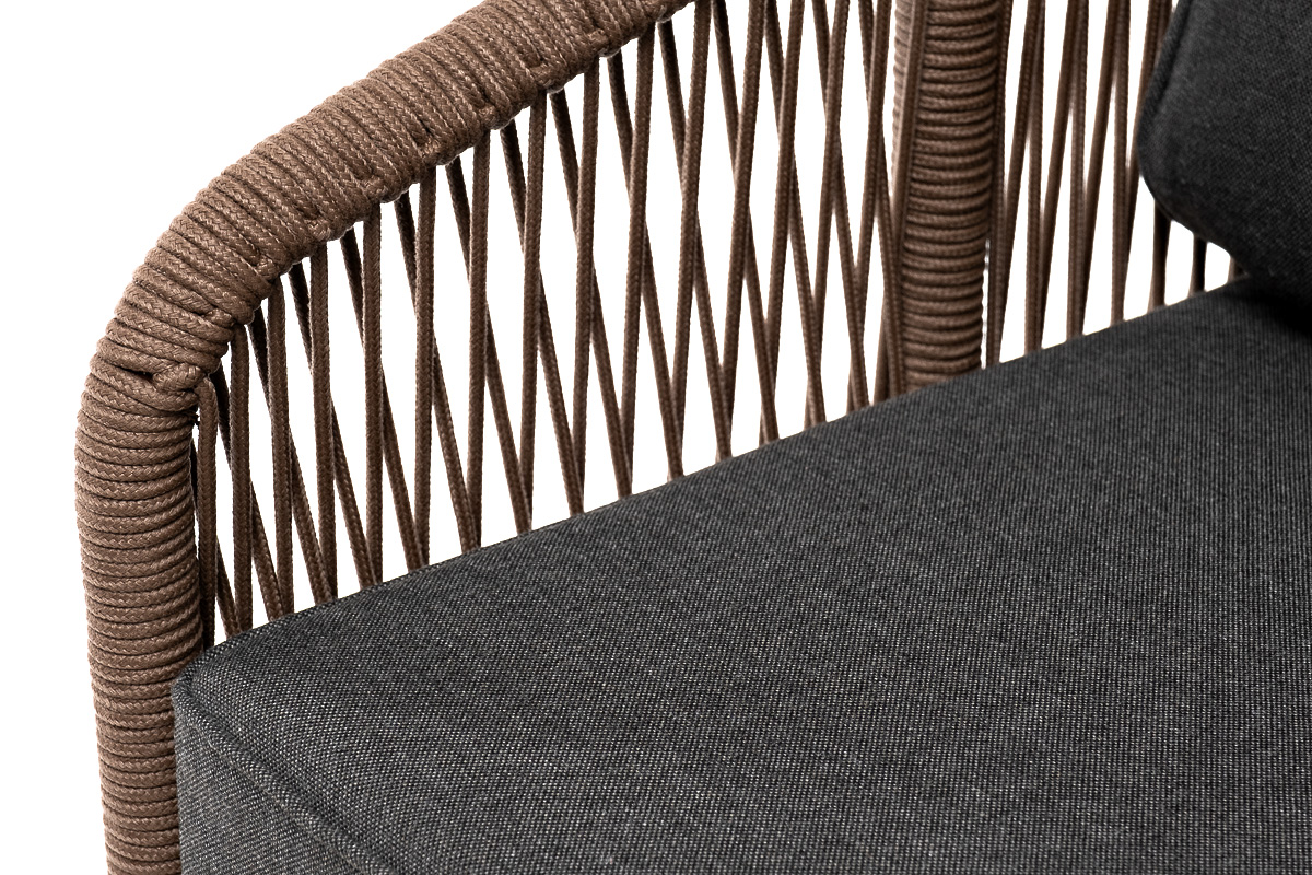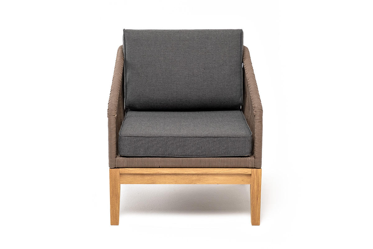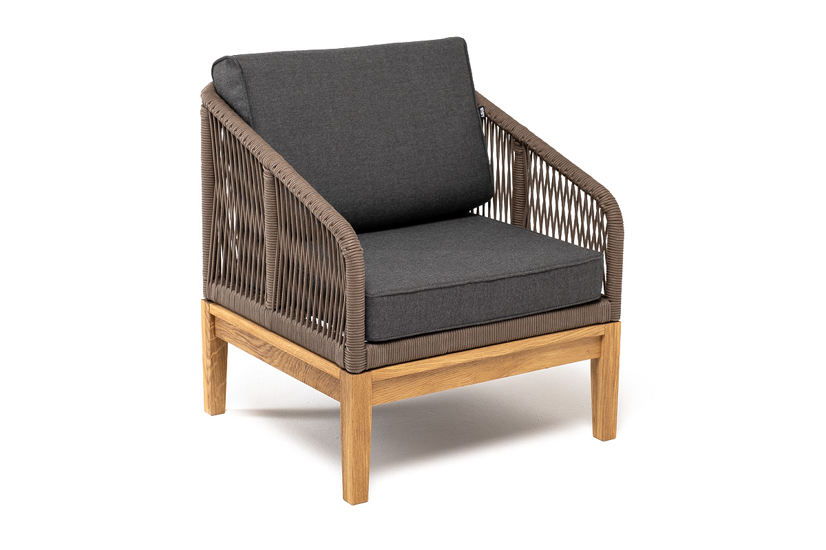 "Канны" кресло плетеное из роупа, основание дуб, роуп коричневый круглый, ткань темно-серая 027