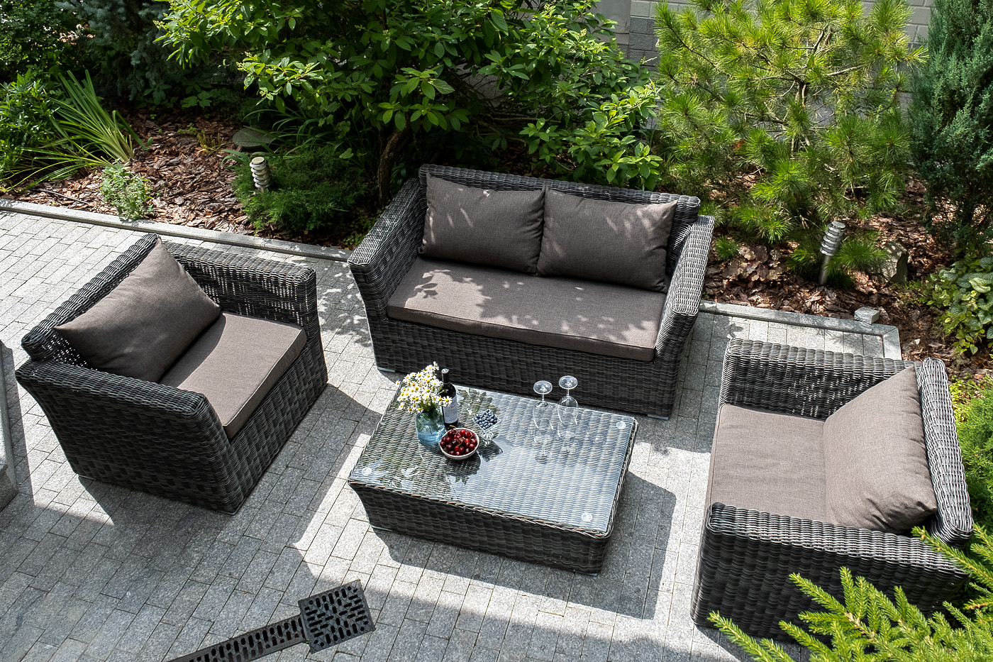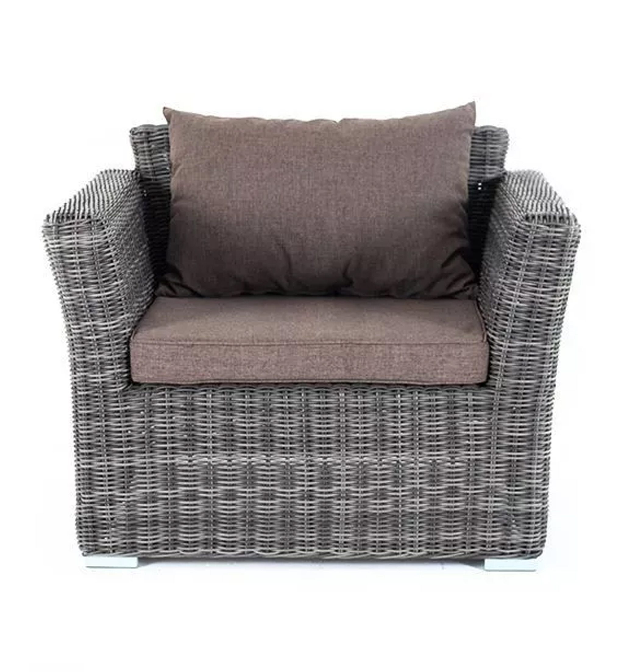 Кресло из круглого искусственного ротанга «Капучино» графитового цвета, прекрасно подходит для обустройства веранды, а относительно небольшой вес, который составляет 20 кг, увеличивает мобильность данной модели.