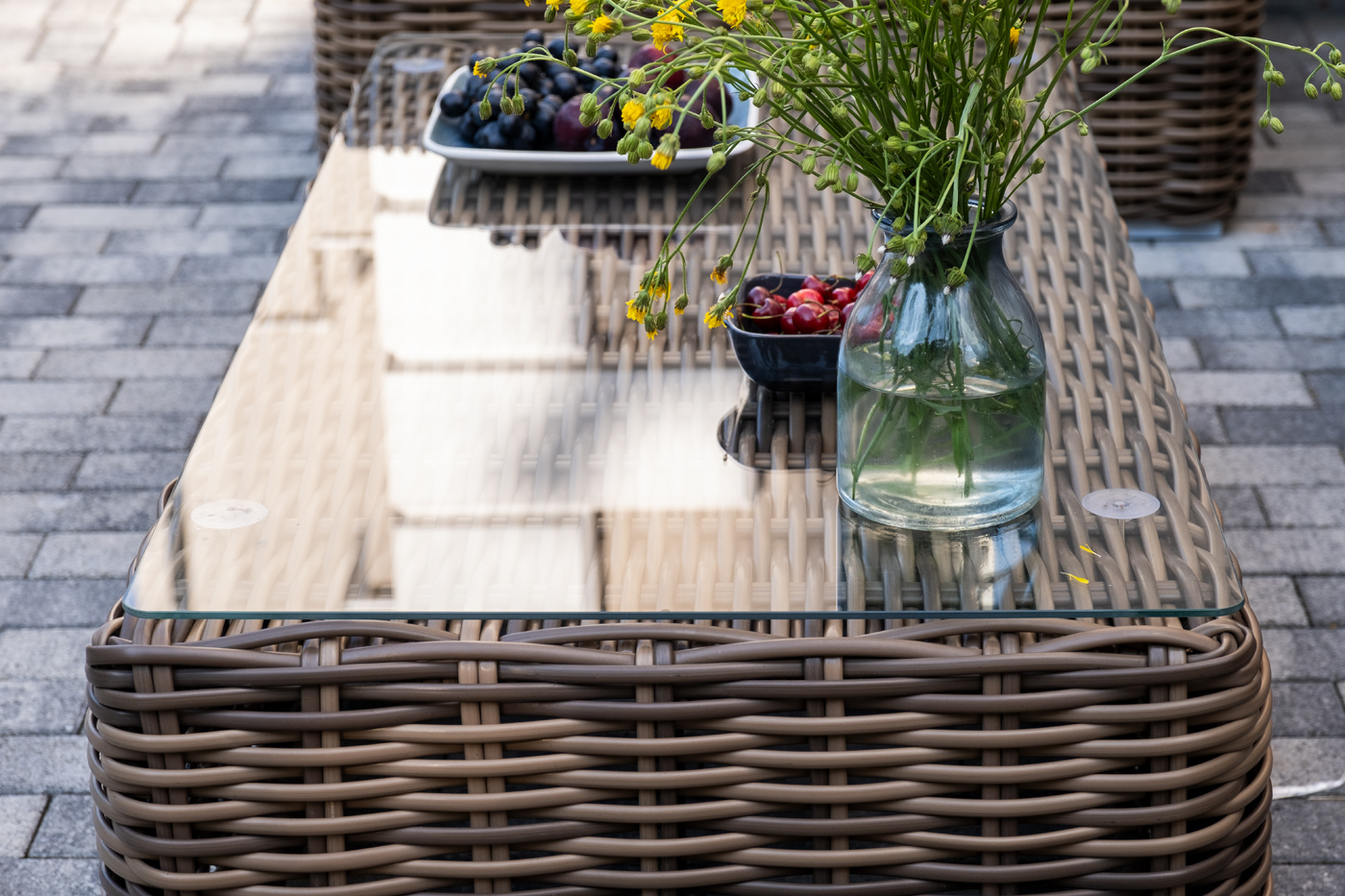 Каркас столика изготовлен из алюминия, вручную оплетенного круглым искусственным ротангом. Столешница из закаленного стекла толщиной 5 мм. Благодаря износостойким материалам, стол пригоден для использования на улице при любой погоде и не требует специальных условий хранения.