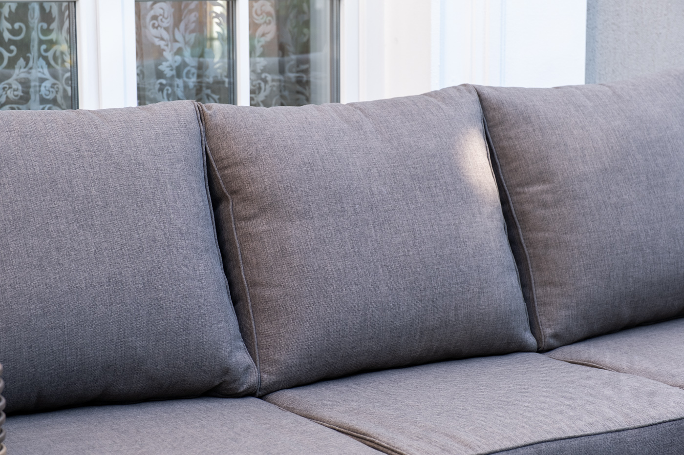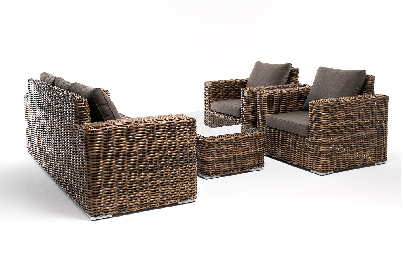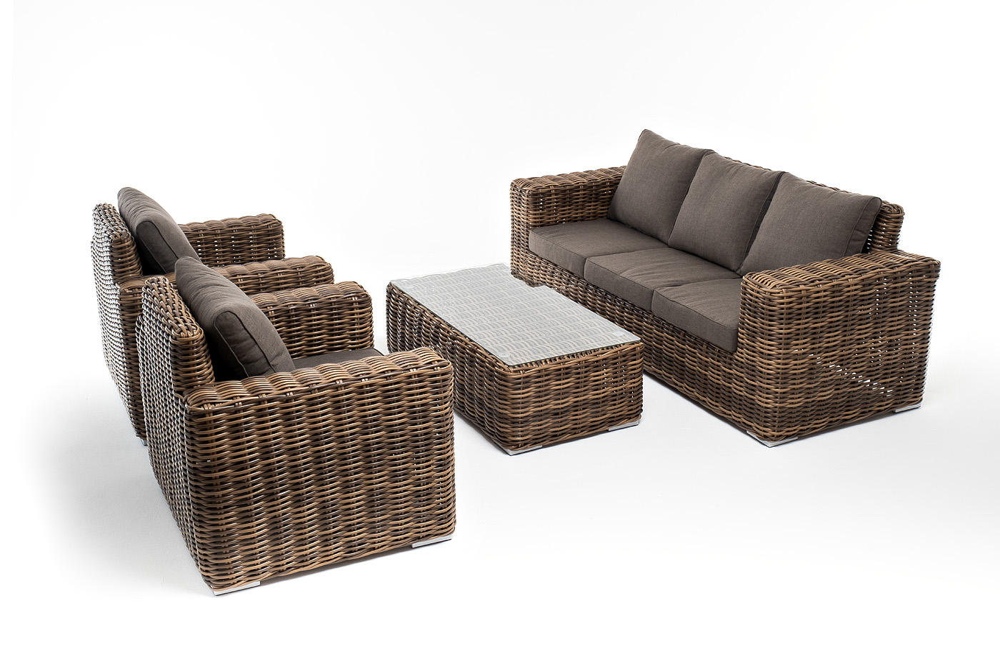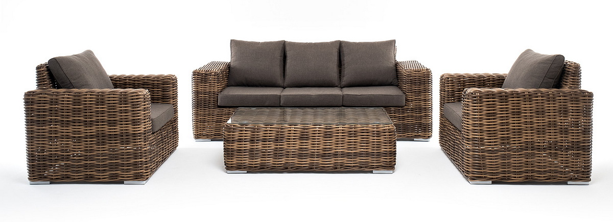 Плетеная мебель дополнена удобными подушками в серо-коричневых чехлах. При их изготовлении используют полиэстер, плотность – 230гр/м2. Он обрабатывается влагоотталкивающей пропиткой для повышения защитных свойств материала.