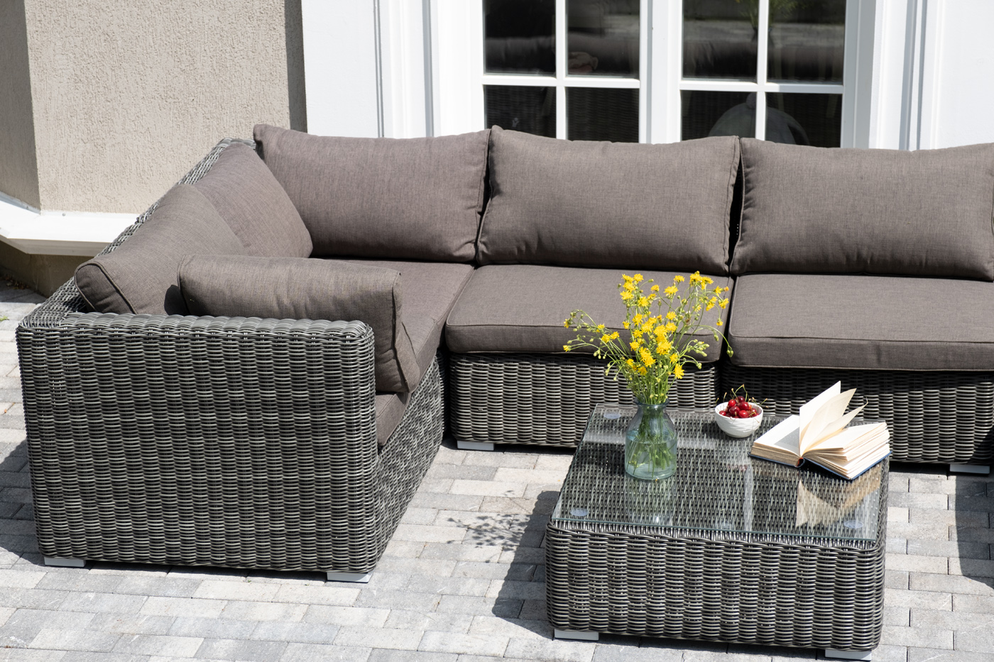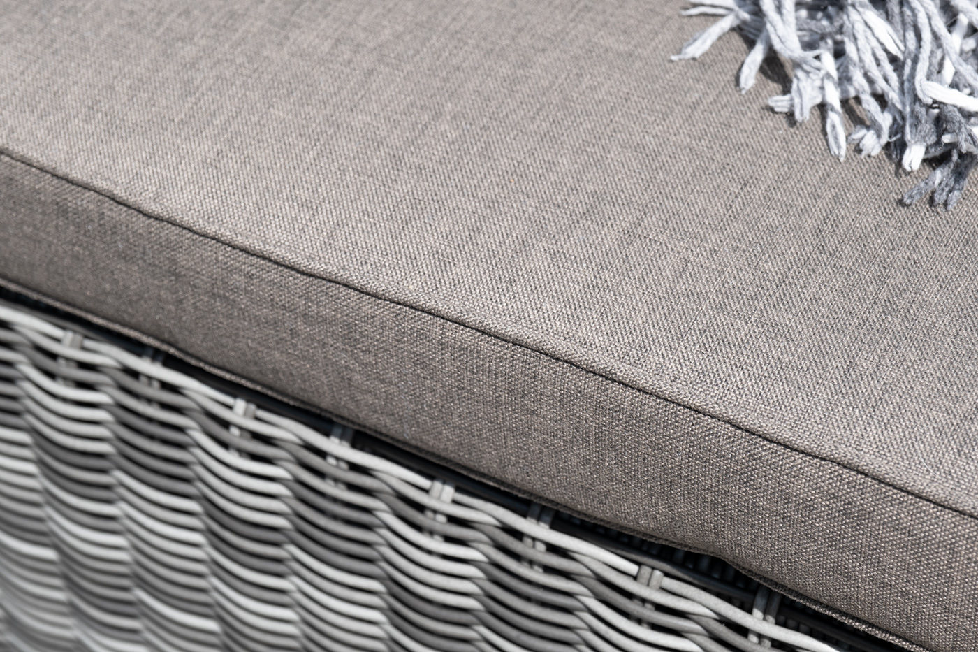 Оплетка выполнена в графитовом оттенке, комплектацией предусмотрены подушки из 100% полиэстера, которые пропитаны специальным составом, обладающим влагоотталкивающим свойством.