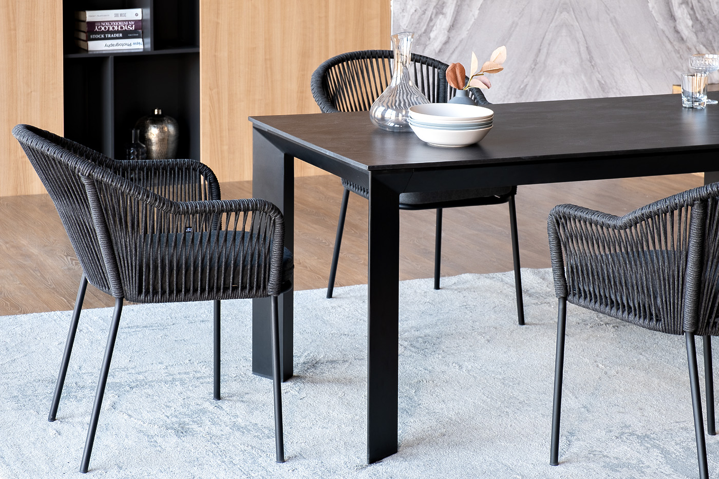 - 4 плетеных стульев «Лион» из роупа, размером - 570×620×820 мм, цвет роупа - темно-серый, каркас стальной, окрашен порошковой краской в темно-серый (RAL7024) оттенок.