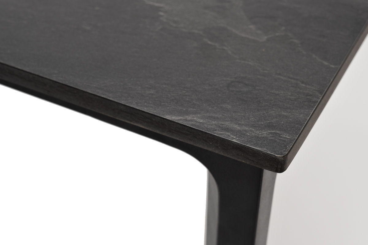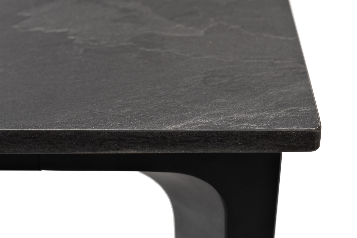 Столешница выполнена из современного высококачественного монолитного компакт-пластик HPL, толщиной 12 мм в цвете «серый гранит». Материал устойчив к высоким температурам, попаданию влаги и может использоваться при любых погодных условиях. Подстолье изготовлено из крашеного алюминия черного цвета.